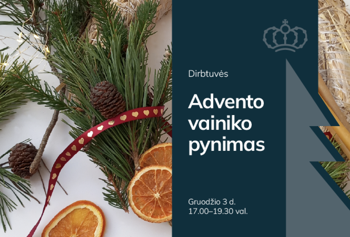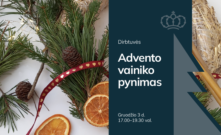 Artėjant Kalėdoms, kviečiame į advento vainikų pynimo dirbtuves! Jaukioje atmosferoje ir maži, ir dideli galės pasinerti į kūrybą, pasigaminti advento vainiką. Jų dekoravimui naudosime natūralias gamtos siūlomas gėrybes: uogas, aukso dulksna padengtus kankorėžius ir džiovintus augalus bei svaiginančio aromato apelsino griežinėlius... Namuose tokį vainiką kviesime praturtinti 4 žvakėmis. Jos uždegamos po vieną kiekvieną Advento sekmadienį ir simbolizuoja laukimą, pasiruošimą gražiausiai metų šventei – Kalėdoms.