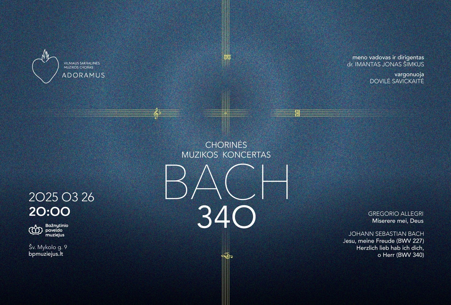 Vienijami bendros misijos puoselėti Lietuvos ir pasaulio bažnytinį paveldą, koncertą drauge rengia VILNIAUS SAKRALINĖS MUZIKOS CHORAS ADORAMUS ir BAŽNYTINIO PAVELDO MUZIEJUS. Muzikos šedevrai skambės pačiame seniausiame ir gausiausiame iš visų Lietuvos Didžiosios Kunigaikštystės bažnyčių lobynų. Jį Vilniaus Šv. arkangelo Mykolo bažnyčioje galės išvysti ir renginio svečiai.