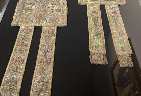 Ekspozicijoje atrasite įvairių gėlių žiedų motyvais siuvinėtų liturginių rūbų, kurių dekoro elementai mena dvi – baroko ir rokoko – epochas.