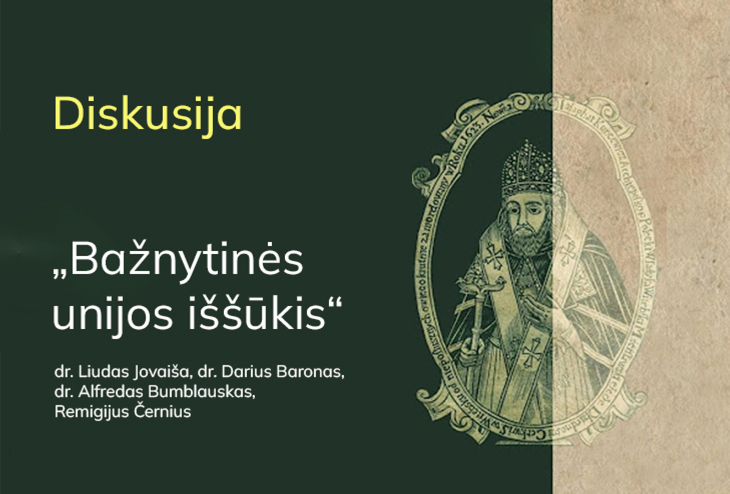 Diskusija „Bažnytinės unijos iššūkis“ – baigiamasis ciklo „Kijevo krikščionybės skaitiniai Vilniuje“ renginys. Joje storikai dr. Liudas Jovaiša, dr. Darius Baronas, dr. Alfredas Bumblauskas ir Remigijus Černius remdamiesi šv. Juozapato pavydžiu istorikai diskutavo apie praeitį – Bažnytinės unijos idėjų puoselėjimą ir jų sklaidą nepalankiose sąlygose – bei dabartį, kai sudėtingi geopolitiniai procesai formuoja naujus kontekstus. Šiandien demokratinis Vakarų pasaulis nestokoja iššūkių. Siekiant sėkmingai spręsti ir atsiliepti į kylančias problemas reikalingi greitas reagavimas, ryžtas ir vienybė. Būtent šiuos bruožus galima įžvelgti šv. Juozapato Kuncevičiaus asmenybėje ir veikloje. Jis nepaisydamas grasinimų ir tykančių pavojų prieš 400 metų vienijo ir globojo LDK istorinėse žemėse gyvenusius Romos katalikus ir stačiatikius. 2023 m. minimas Vilniaus 700 metų jubiliejus ir 400-osios šv. Juozapato Kuncevičiaus (apie 1580–1623) kankinystės metinės. Šios sukakties proga Lietuvos Respublikos Seimui paskelbus 2023-iuosius šventojo Juozapato metais, Vilniaus arkivyskupijos Bažnytinio paveldo muziejus kviečia į renginių ciklą „Kijevo krikščionybės skaitiniai Vilniuje“. Visus metus truksiantys renginiai leis pažinti šventojo Juozapato asmenį, jo epochą, rusėnišką Lietuvos Didžiosios Kunigaikštystės dėmenį, istorinius ir kultūrinius Ukrainos ir Lietuvos ryšius. Renginių cikle – mokslininkų paskaitos, diskusijos Bažnytinės unijos ir unitiško kultūros paveldo klausimais, ekskursijos Vilniaus Švč. Trejybės Graikų apeigų katalikų bažnyčioje. Šv. Juozapato metų kulminacija taps 2023-iųjų rudenį atidaroma tarptautinė paroda „Tegul visi bus viena. Šv. Juozapato Kuncevičiaus kankinystei – 400“.
