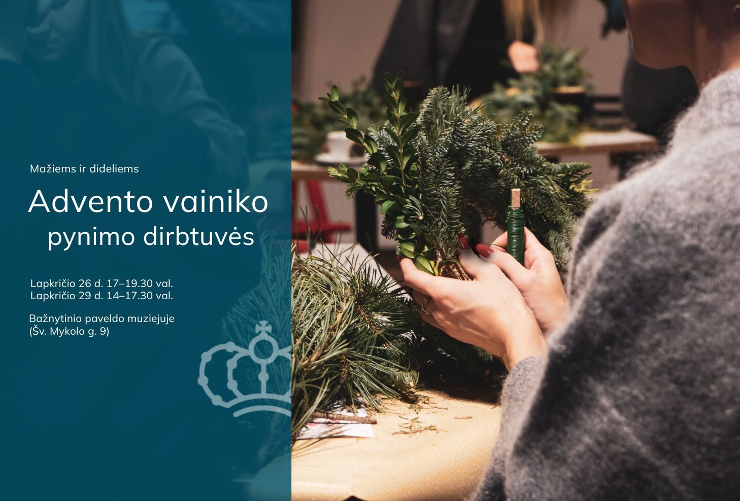 Artėjant Kalėdoms, kviečiame į advento vainikų pynimo dirbtuves! Jaukioje atmosferoje ir maži, ir dideli galės pasinerti į kūrybą, pasigaminti advento vainiką. Jų dekoravimui naudosime natūralias gamtos siūlomas gėrybes: uogas, aukso dulksna padengtus kankorėžius ir džiovintus augalus bei svaiginančio aromato apelsino griežinėlius... Namuose tokį vainiką kviesime praturtinti 4 žvakėmis. Jos uždegamos po vieną kiekvieną Advento sekmadienį ir simbolizuoja laukimą, pasiruošimą gražiausiai metų šventei – Kalėdoms.