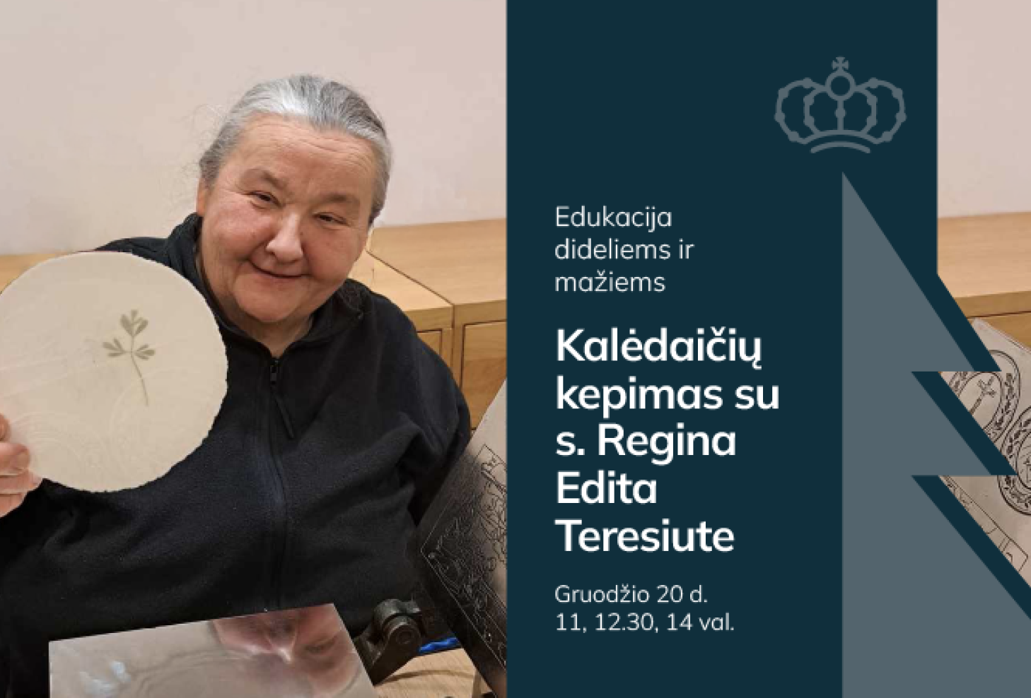 Užsiėmimą ves s. Regina Edita Teresiutė iš Eucharistinio Jėzaus seserų kongregacijos – rezistentė ir „Lietuvos Katalikų Bažnyčios kronikos“ leidėja, kalėdaičius kepanti jau 40 metų. S. Regina papasakos, kaip kepami kalėdaičiai, atsakys į dalyvių klausimus ir pasidalins artėjančio Kristaus gimimo įvykio teikiama viltimi.
