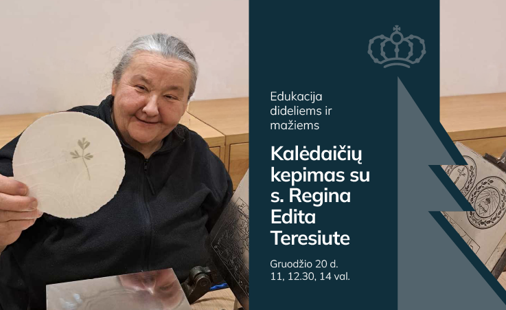 Užsiėmimą ves s. Regina Edita Teresiutė iš Eucharistinio Jėzaus seserų kongregacijos – rezistentė ir „Lietuvos Katalikų Bažnyčios kronikos“ leidėja, kalėdaičius kepanti jau 40 metų. S. Regina papasakos, kaip kepami kalėdaičiai, atsakys į dalyvių klausimus ir pasidalins artėjančio Kristaus gimimo įvykio teikiama viltimi.