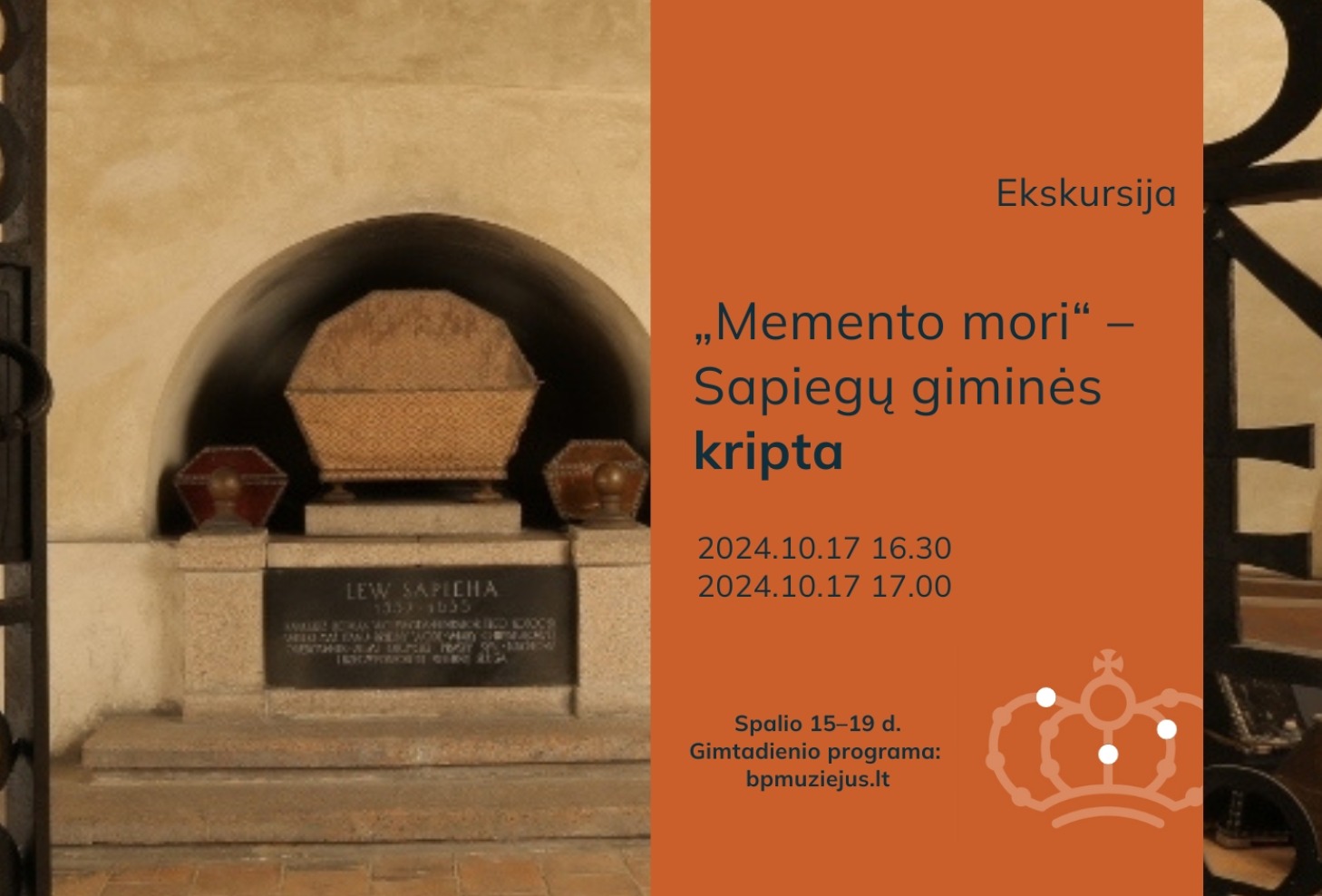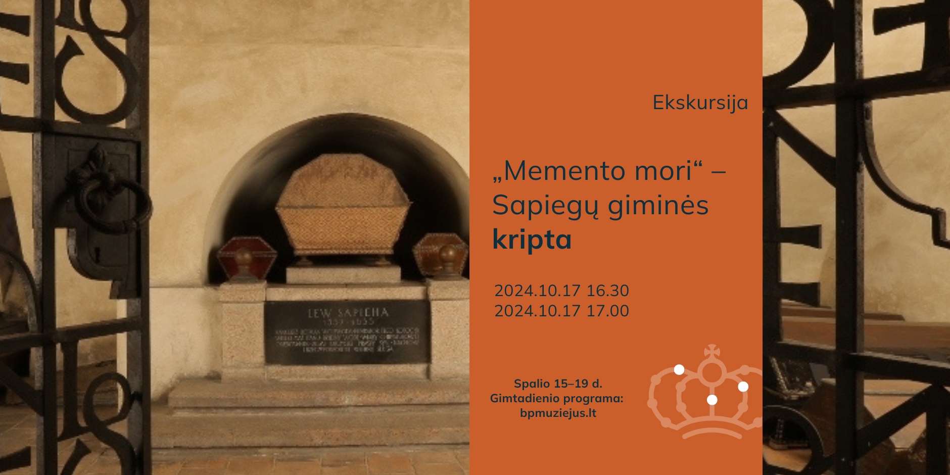 Bažnytinio paveldo muziejaus jubiliejinio gimtadienio proga atveriame Šv. arkangelo Mykolo bažnyčios Sapiegų kriptą. Joje lankydamiesi kalbėsime apie tai, kaip kito mirties samprata, kaip buvo ruošiamasi ją sutikti, kokią žinią amžininkams ir ateities kartoms siekė perteikti prašmatnūs mauzoliejai, antkapiai ir epitafijos.
